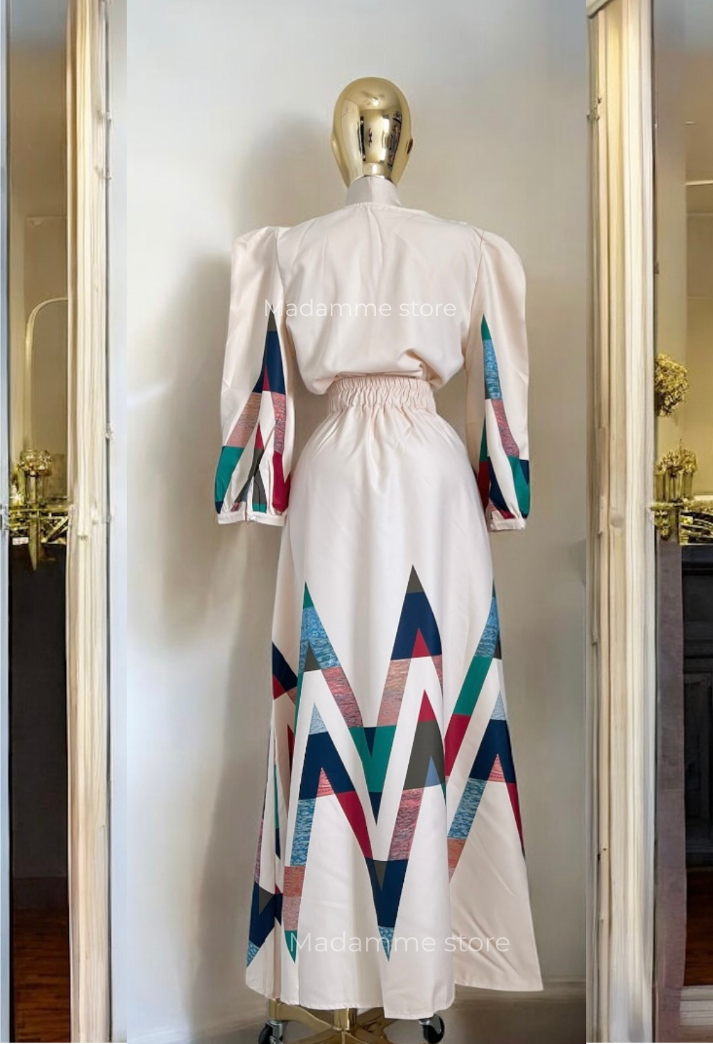 En el universo de la moda, existen piezas que trascienden lo cotidiano para convertirse en verdaderas declaraciones de estilo. Este conjunto en tono beige suave, enriquecido con un diseño geométrico multicolor, es una oda a la elegancia contemporánea y al poder de los contrastes.