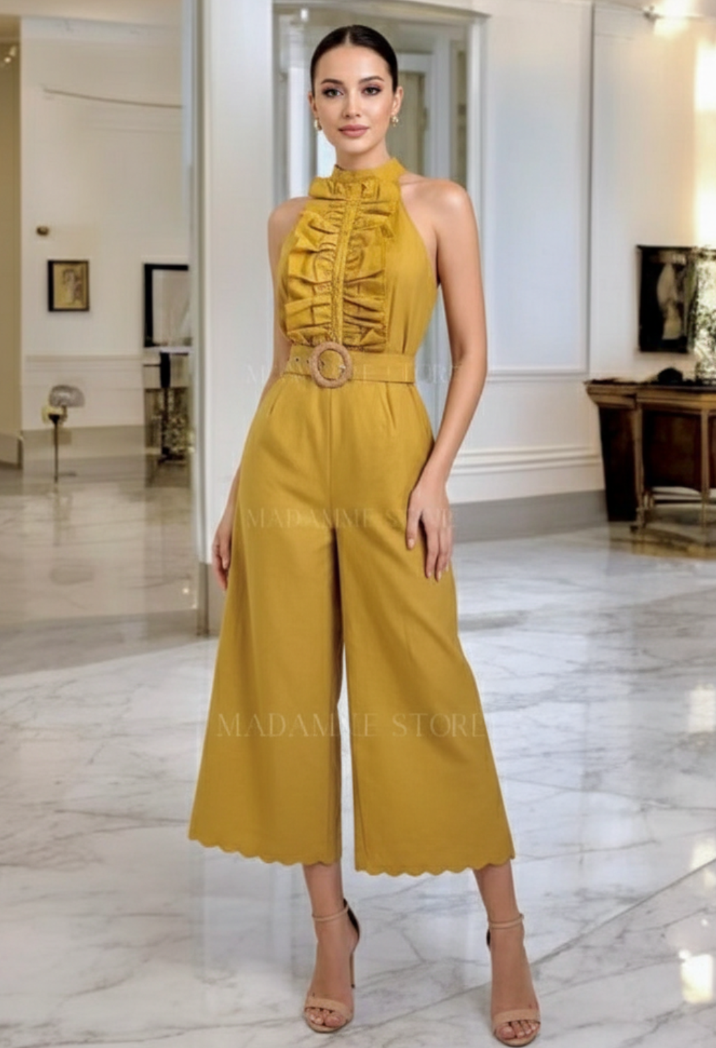 Descubre la sofisticación con este palazzo amarillo, diseñado para destacar con detalles únicos y elegantes. El cuello alto con volantes y el corpiño halter añaden un toque de distinción, mientras que los detalles festoneados del pantalón elevan el glamour y el estilo de tu look. Perfecto para cualquier ocasión especial, este mono te asegura una apariencia encantadora y a la moda. ¡Luce radiante y confidente con esta prenda imprescindible en tu guardarropa!
