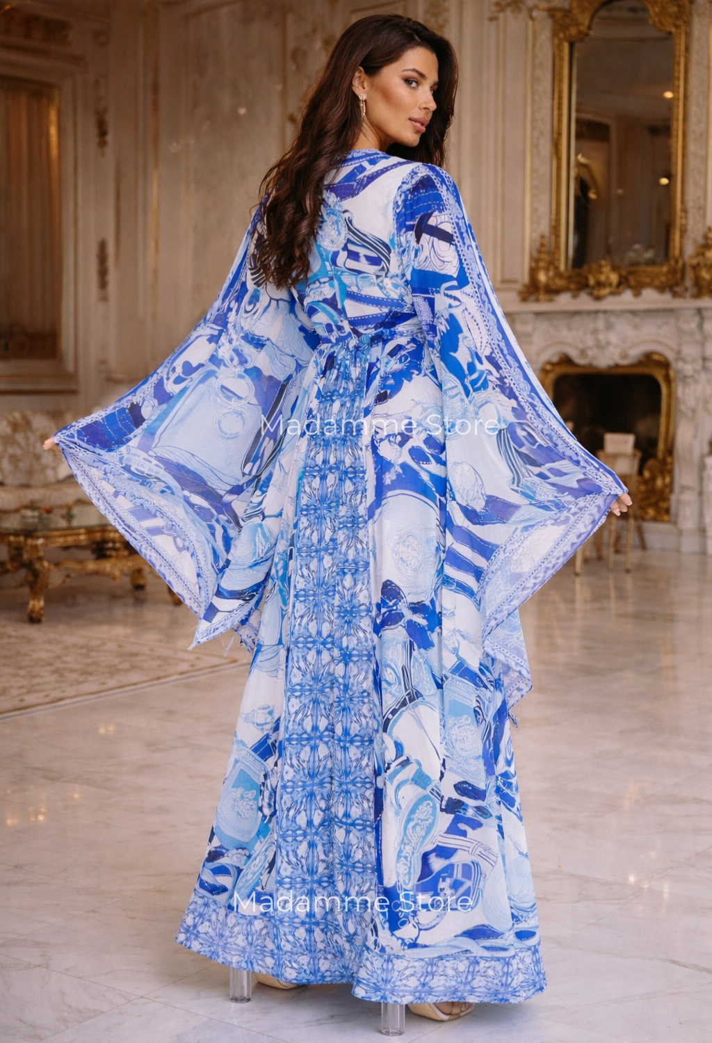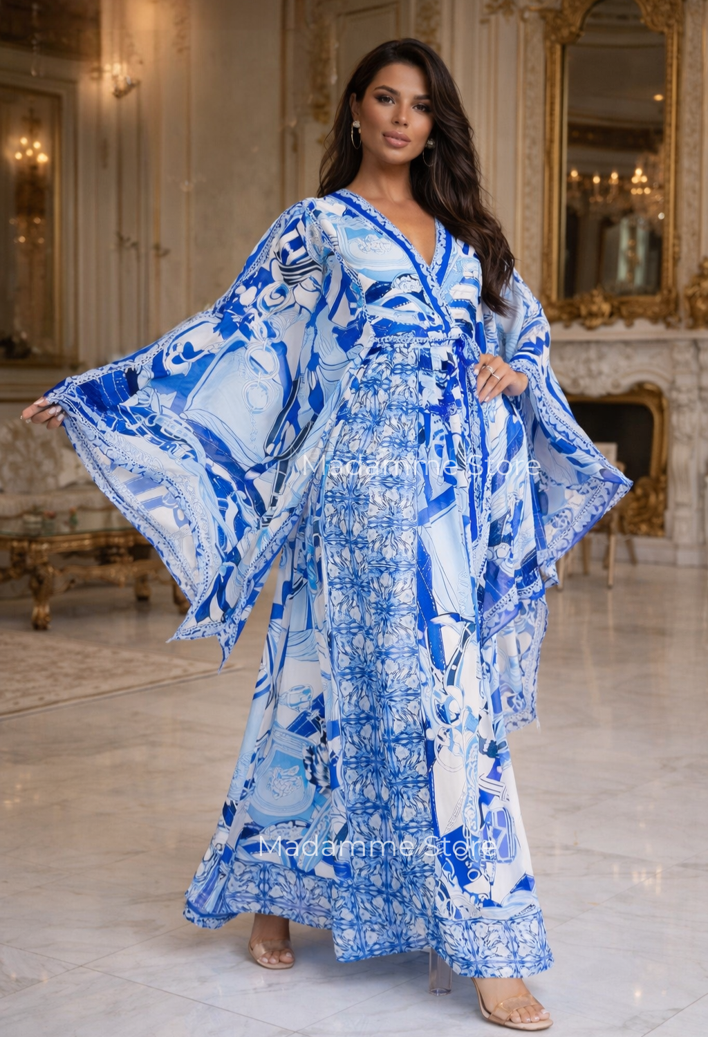 Presentamos nuestro vestido estampado de porcelana en azul y blanco, una prenda que trasciende lo común. Su diseño fluido con mangas amplias y un escote en V resalta tu silueta con una elegancia inigualable. Este vestido no solo es ligero; es imponente y majestuoso, ideal para que brilles en cualquier ocasión.