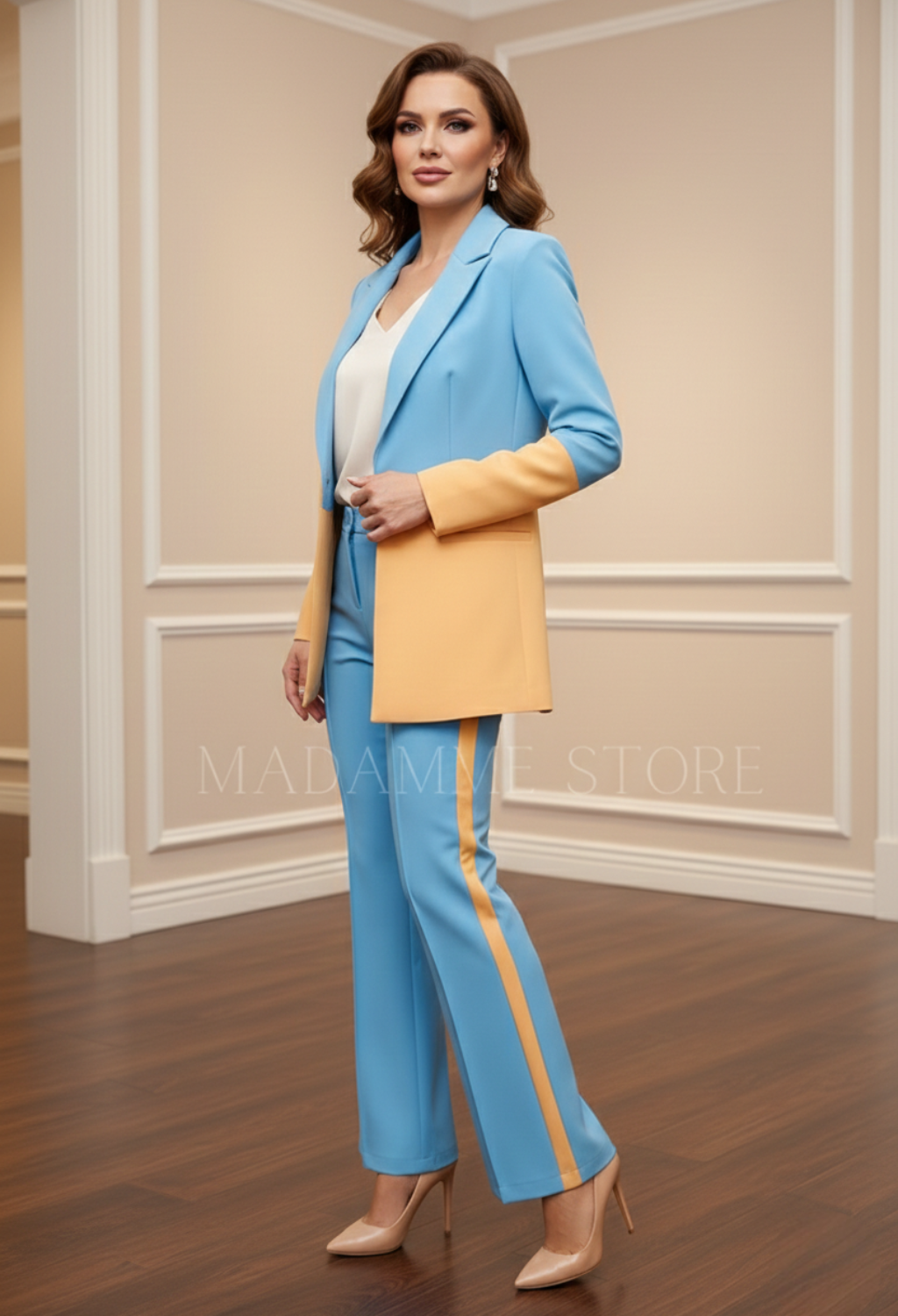 Esta es una pieza única para aquellas mujeres que valoran la moda de alto nivel y el diseño impecable. ¡Luce segura y sofisticada en cada evento y deja una impresión duradera! 💙🧡