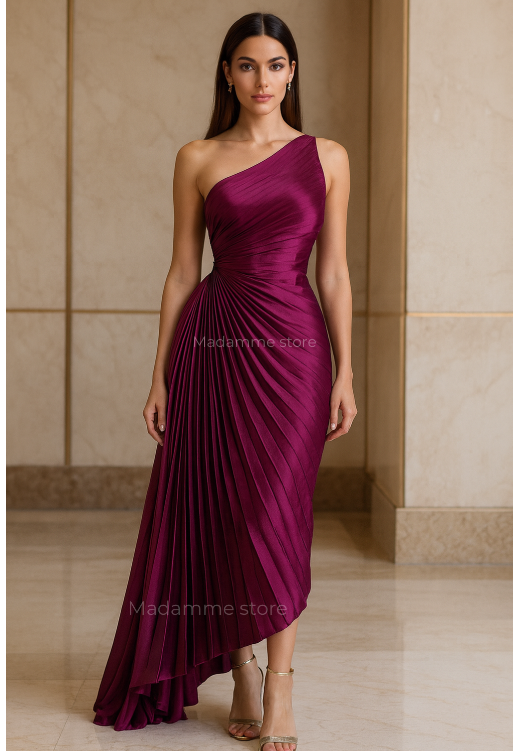 El diseño de un solo hombro, acompañado de un plisado perfectamente distribuido, crea un efecto visual de alta costura que estiliza la figura de manera exquisita. Cada pliegue está pensado para aportar profundidad, elegancia y un brillo sutil que realza la belleza de su color.
