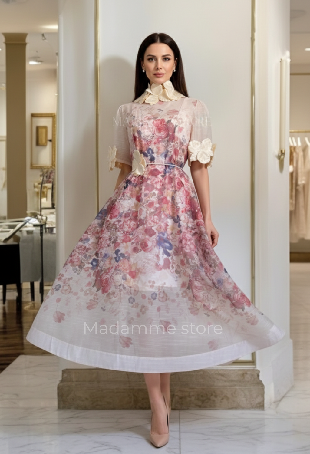 Lo más especial: aplicaciones florales en 3D que embellecen el cuello, las mangas y el cinturón, añadiendo textura y dimensión al diseño. Cada flor ha sido cuidadosamente colocada para crear un efecto visual delicado y lujoso, elevando la pieza a una categoría superior.