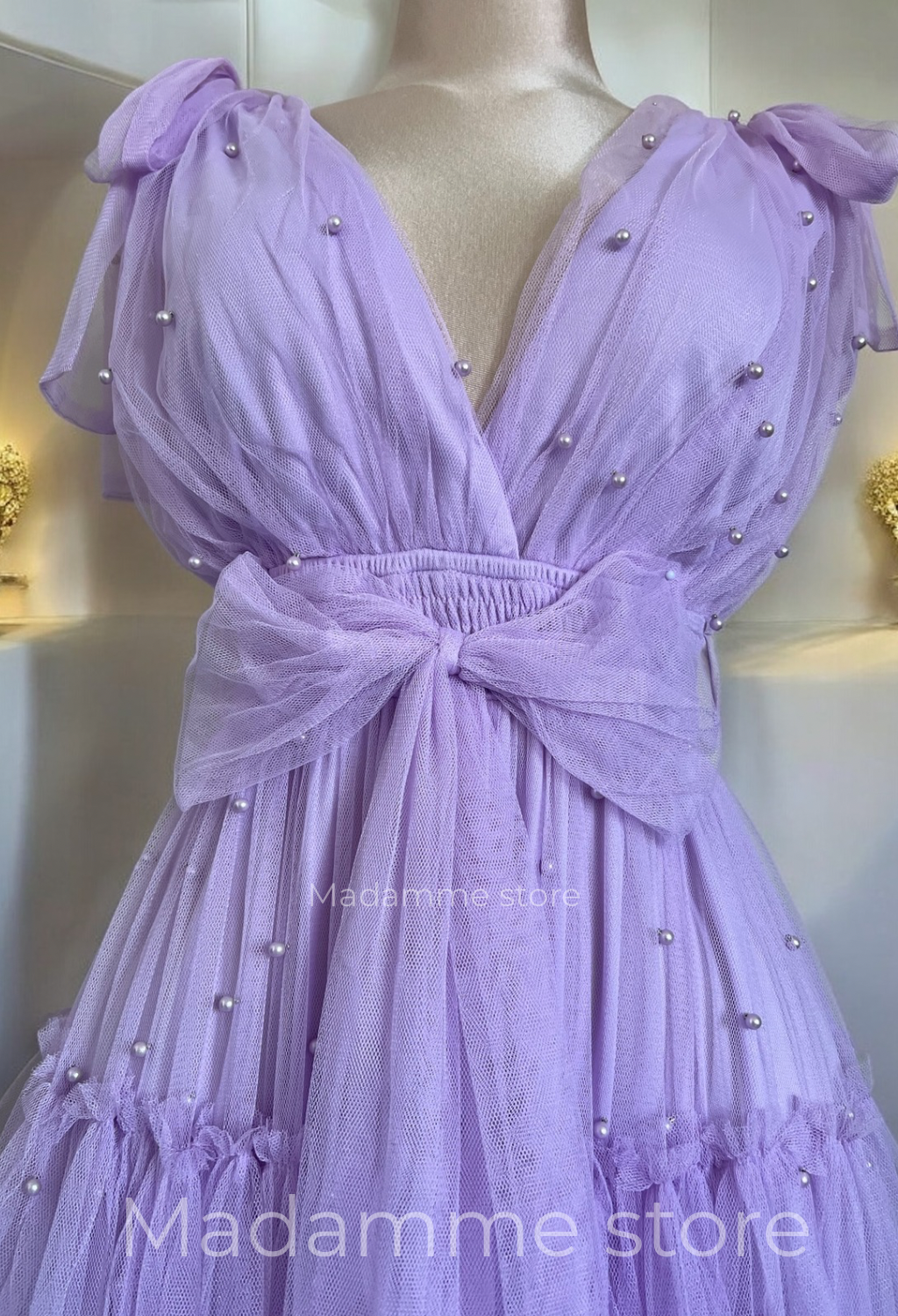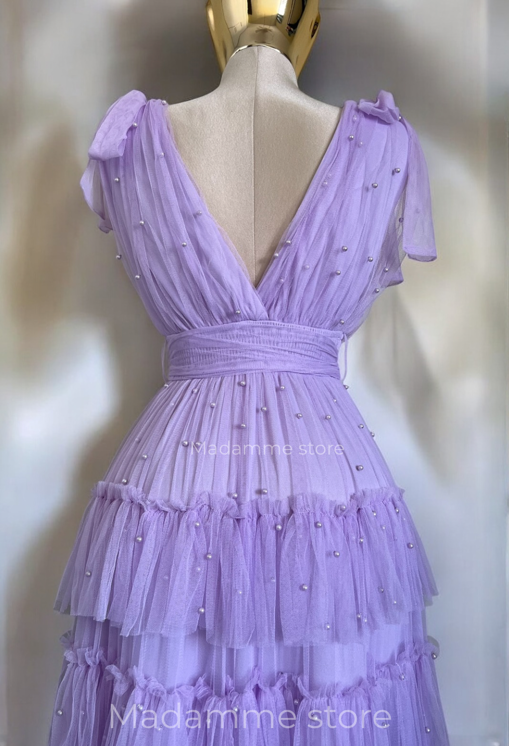 Déjate envolver por la magia y la sofisticación de este vestido que parece salido de un cuento moderno. Su tonalidad lavanda —suave, femenina y etérea— se fusiona con un diseño impecable que conquista a primera vista.